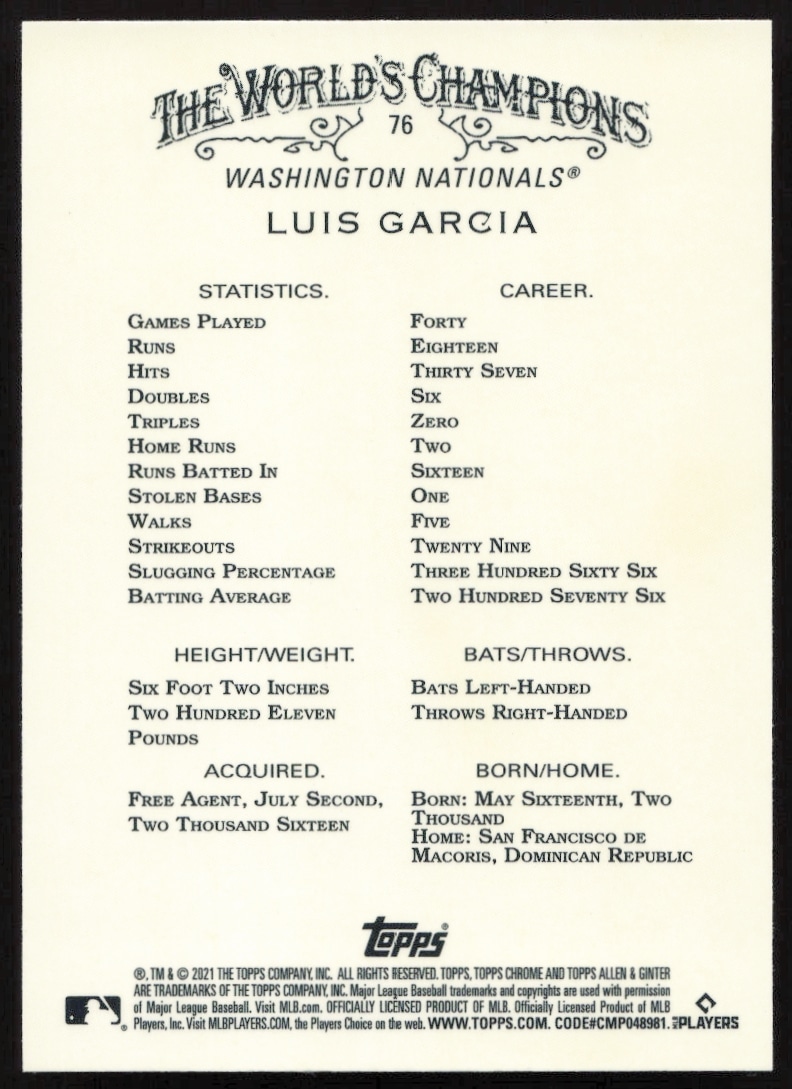 This Baseball card, from 2021 is part of the Topps Allen & Ginter Chrome card set. Luis Garcia is featured and has a card number of 76.