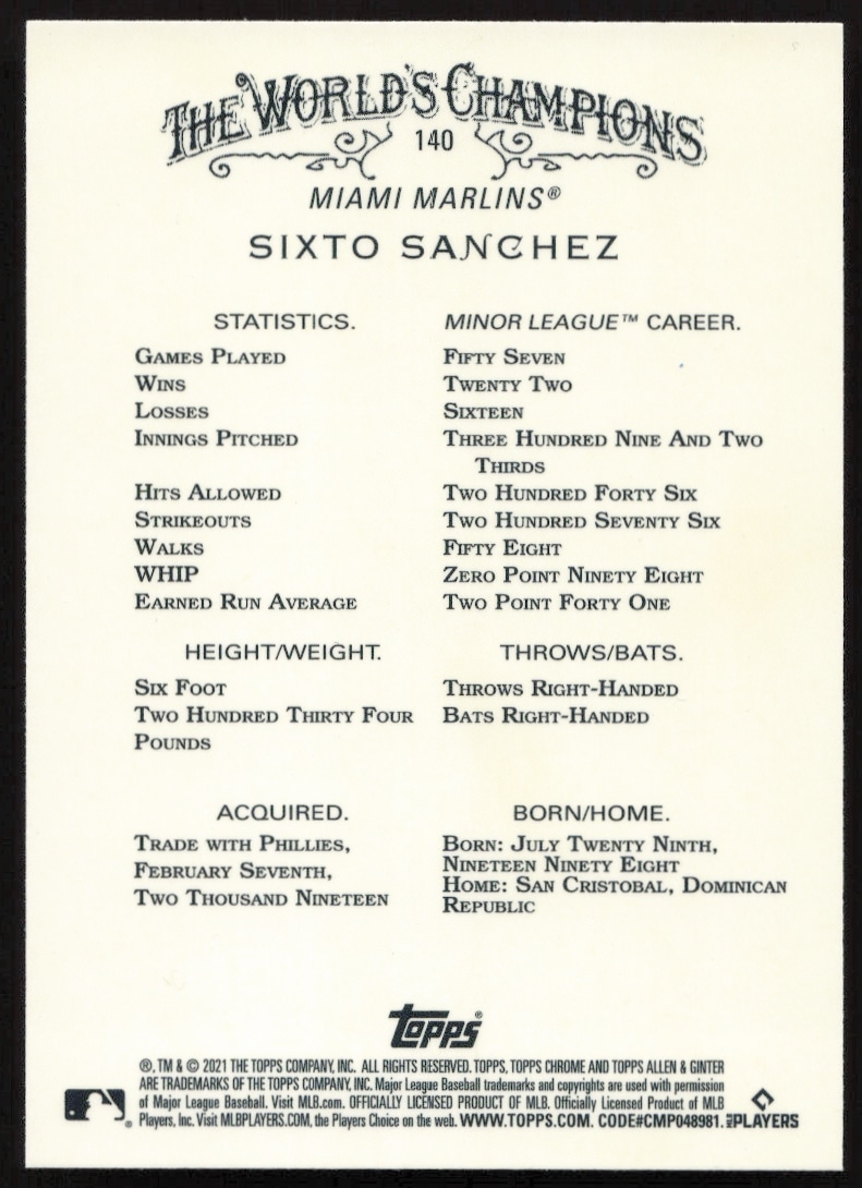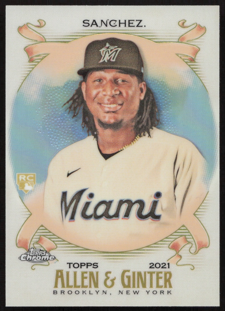 This Baseball card, from 2021 is part of the Topps Allen & Ginter Chrome card set. Sixto Sanchez is featured and has a card number of 140.
