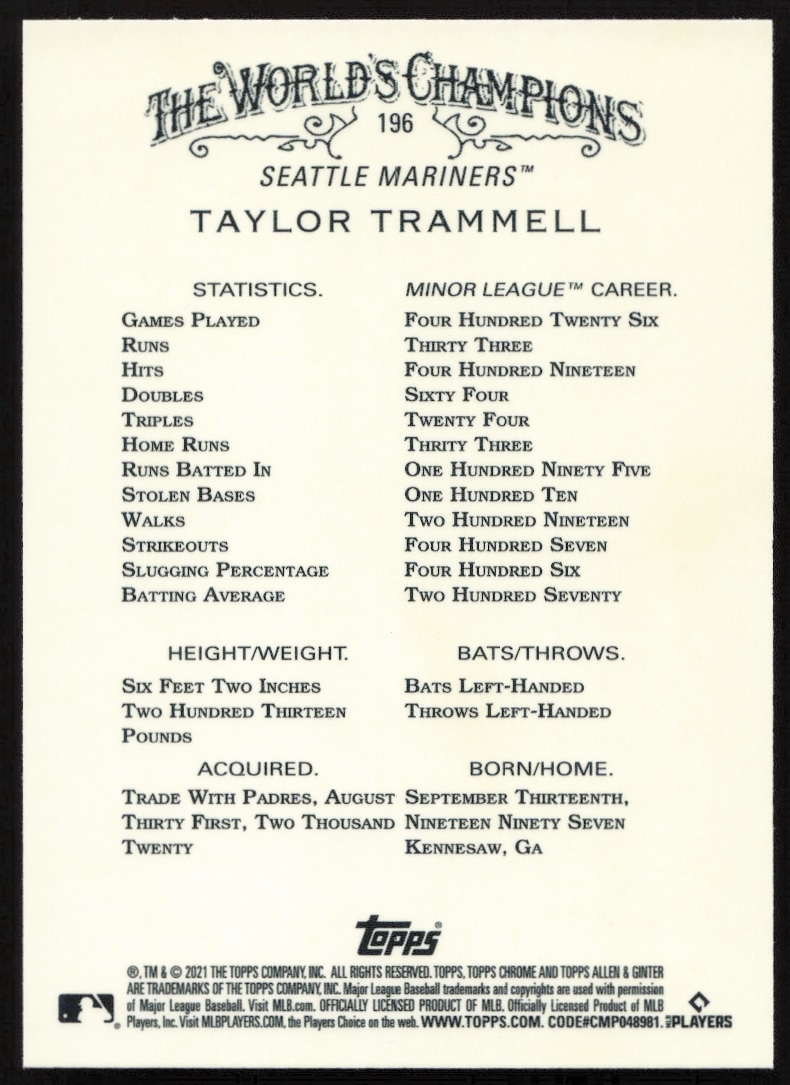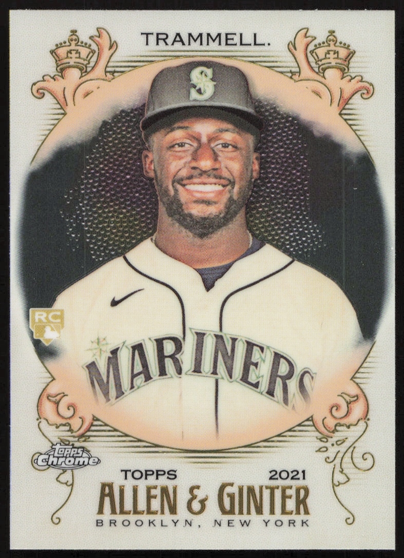 This Baseball card, from 2021 is part of the Topps Allen & Ginter Chrome card set. Taylor Trammell is featured and has a card number of 196.