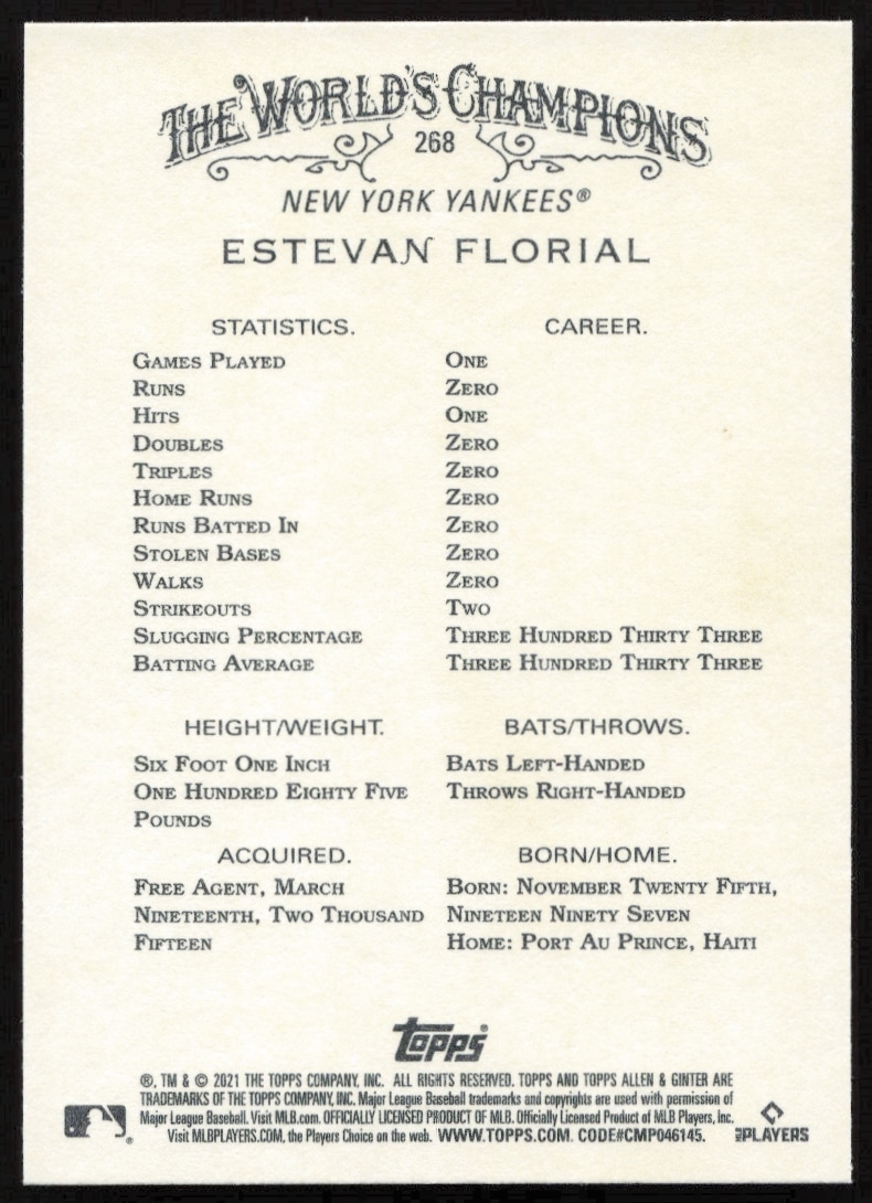 This Baseball card, from 2021 is part of the Topps Allen & Ginter card set. Estevan Florial is featured and has a card number of 268.