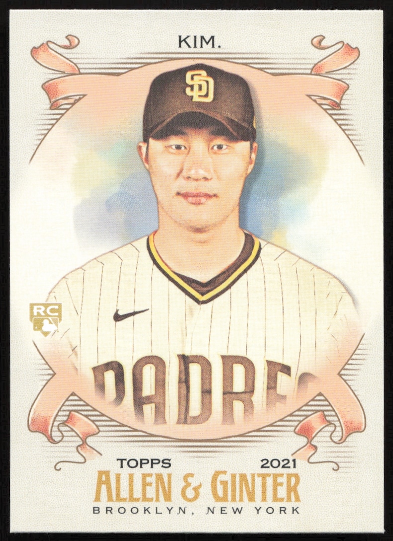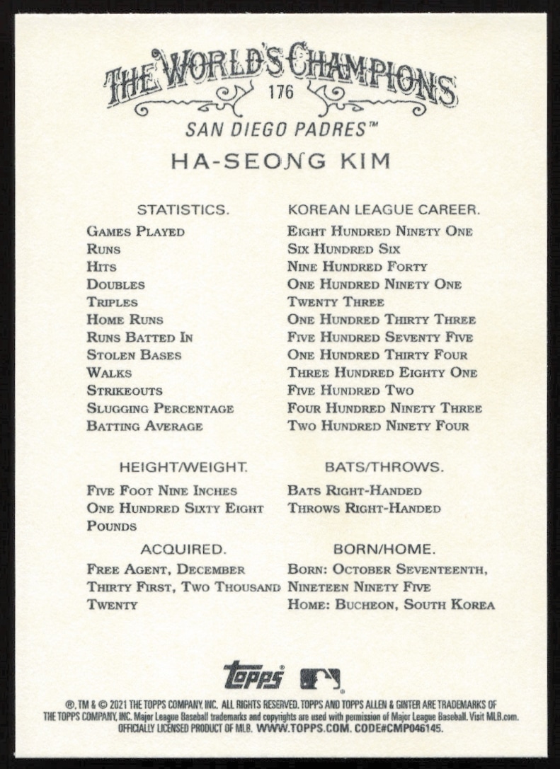 This Baseball card, from 2021 is part of the Topps Allen & Ginter card set. Ha-Seong Kim is featured and has a card number of 176.