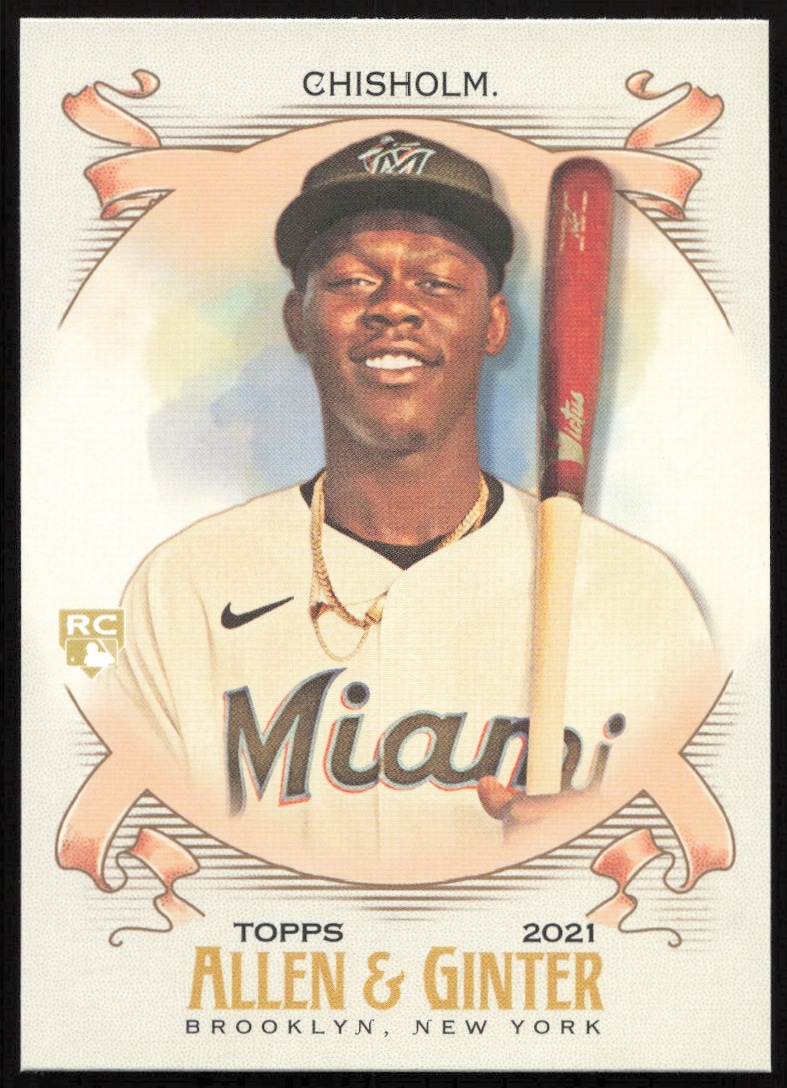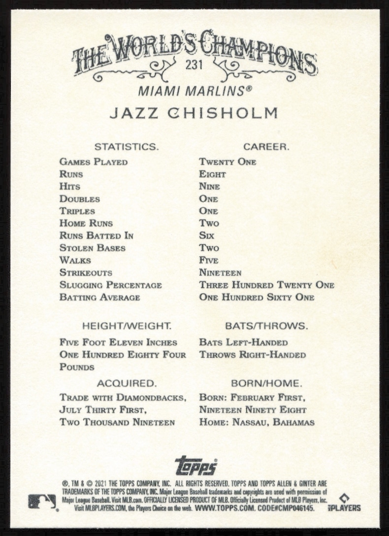 This Baseball card, from 2021 is part of the Topps Allen & Ginter card set. Jazz Chisholm is featured and has a card number of 231.