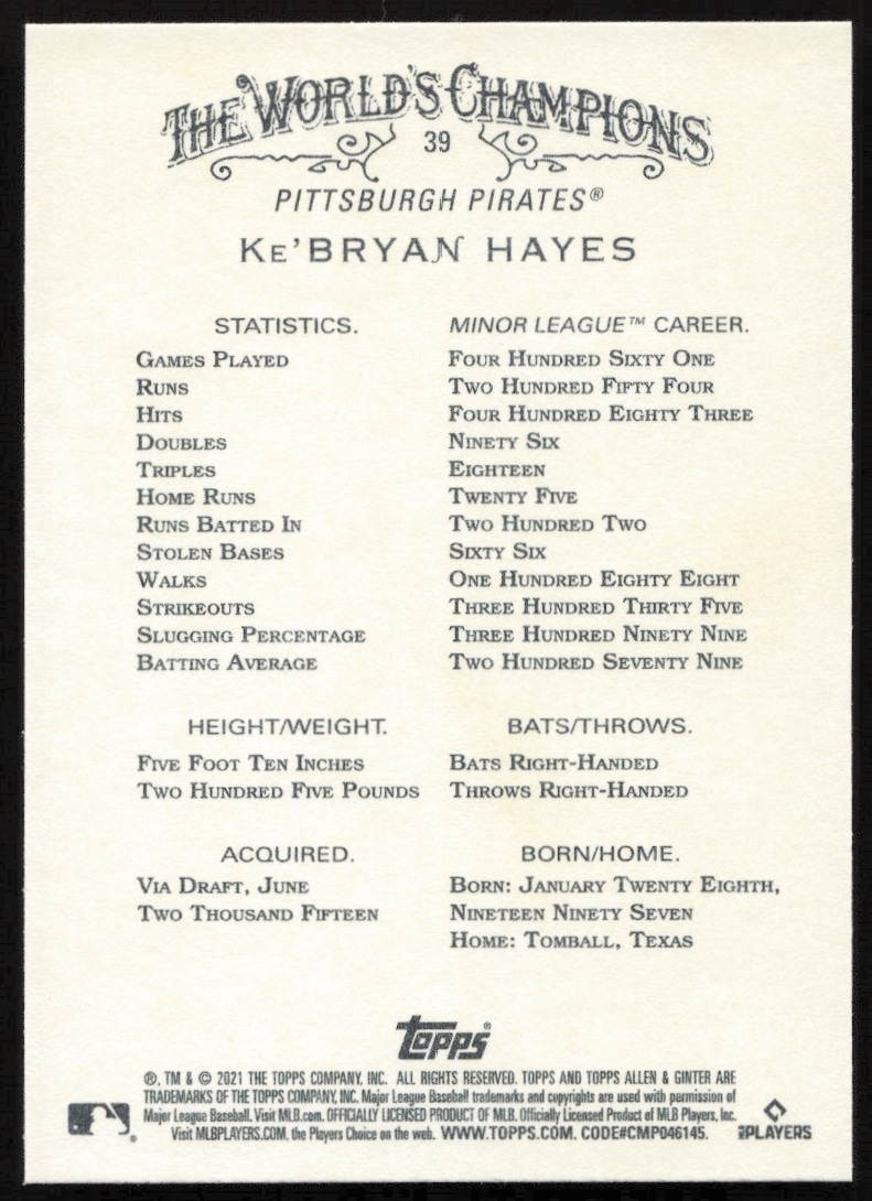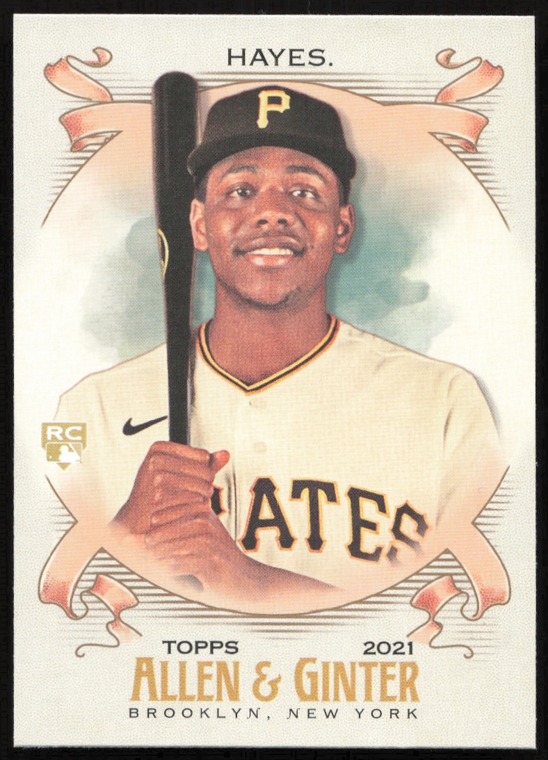 This Baseball card, from 2021 is part of the Topps Allen & Ginter card set. Ke’Bryan Hayes is featured and has a card number of 39.