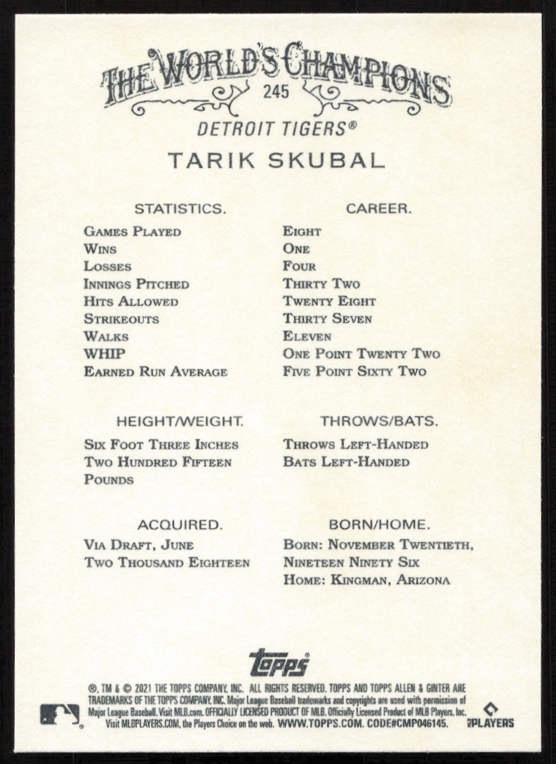 This Baseball card, from 2021 is part of the Topps Allen & Ginter card set. Tarik Skubal is featured and has a card number of 245.