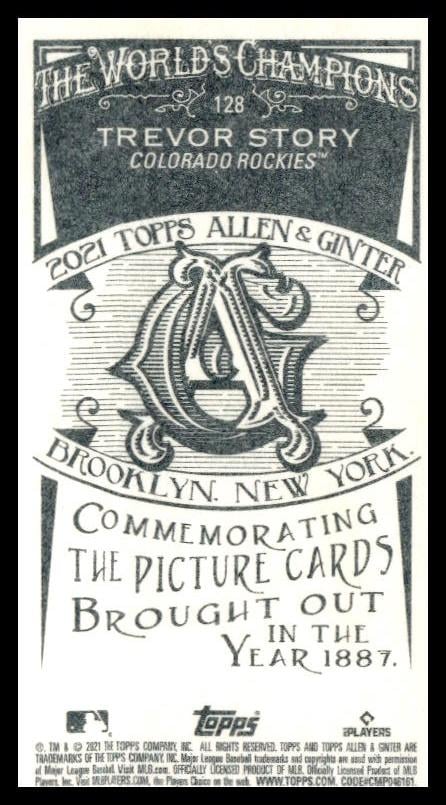 This BaseballΒ card, from 2021 is part of the Topps Allen & GinterΒ card set. Trevor Story is featured and has a card number of 128.