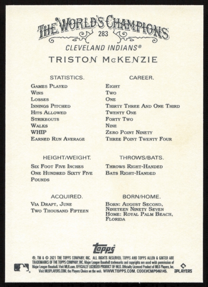 This Baseball card, from 2021 is part of the Topps Allen & Ginter card set. Triston McKenzie is featured and has a card number of 283.