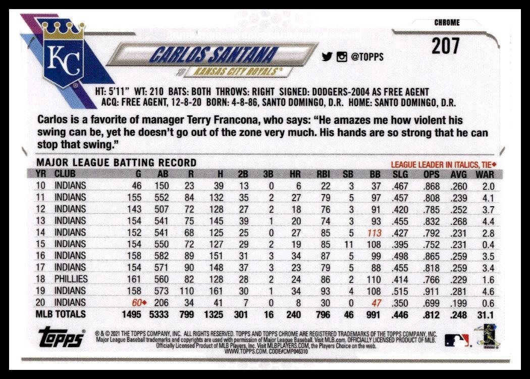 This BaseballΒ card, from 2021 is part of the Topps ChromeΒ card set. Carlos Santana is featured and has a card number of 207.