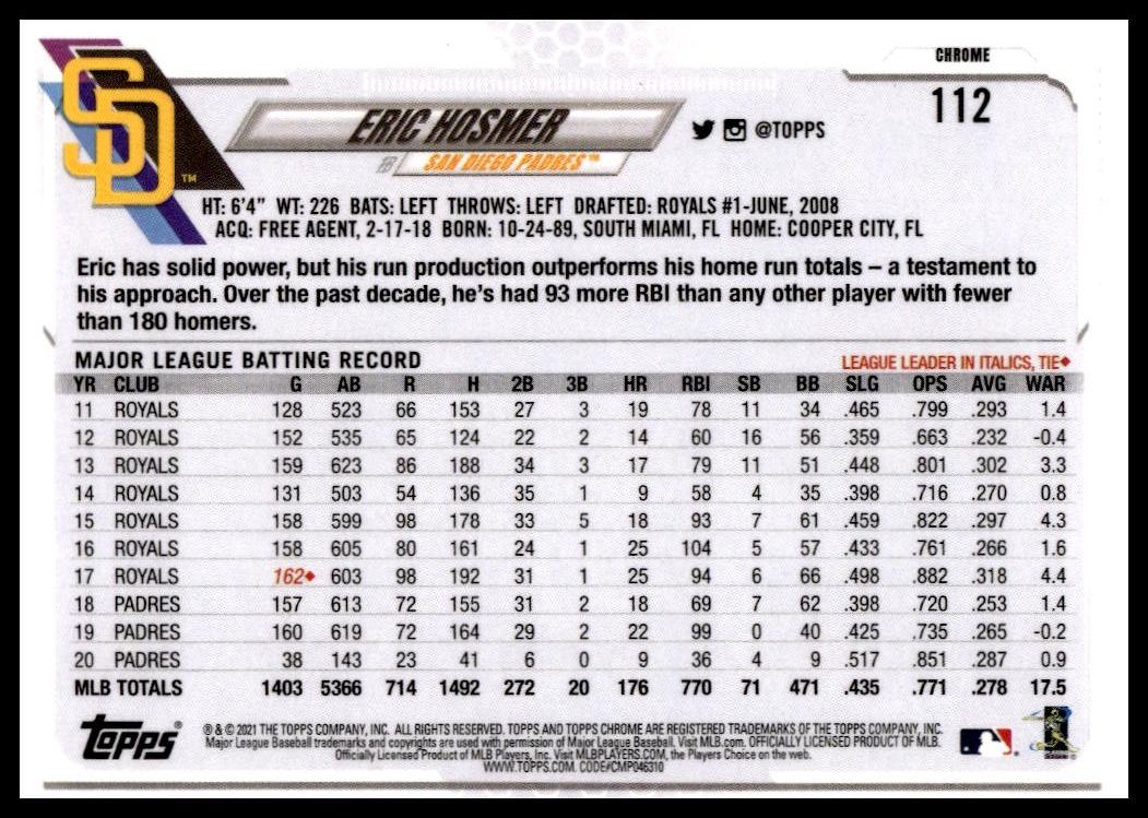 This BaseballΒ card, from 2021 is part of the Topps ChromeΒ card set. Eric Hosmer is featured and has a card number of 112.