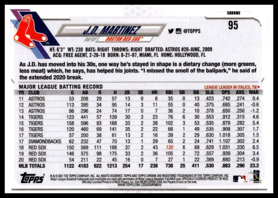 This BaseballΒ card, from 2021 is part of the Topps ChromeΒ card set. J.D. Martinez is featured and has a card number of 95.
