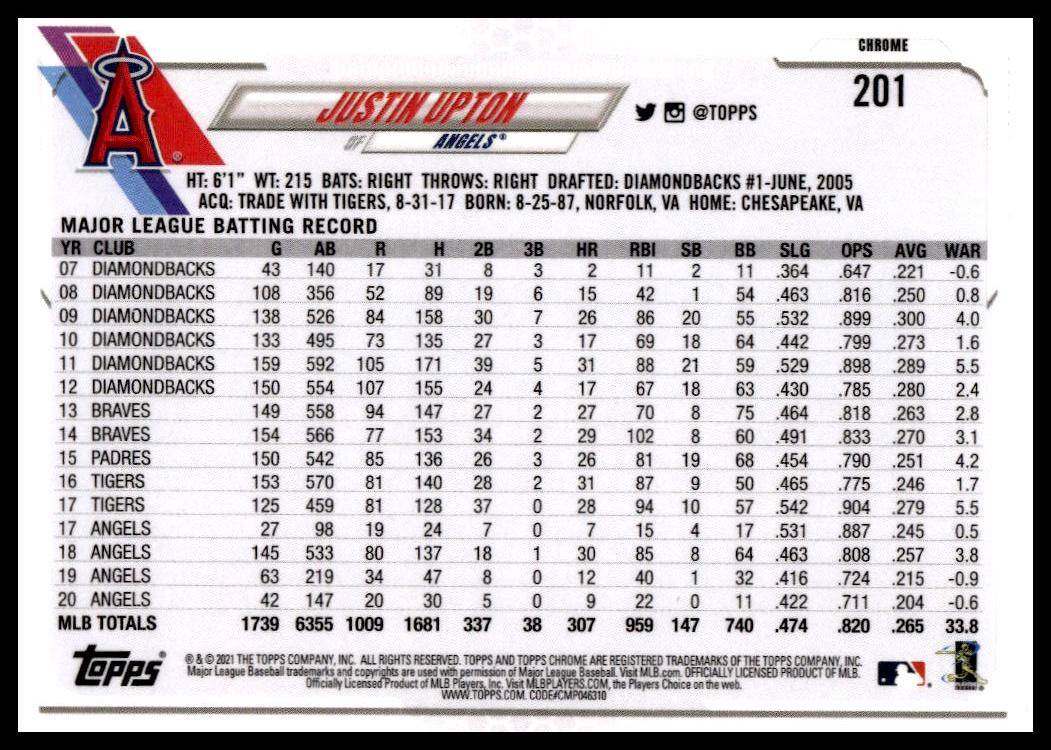 This Baseball card, from 2021 is part of the Topps Chrome card set. Justin Upton is featured and has a card number of 201.