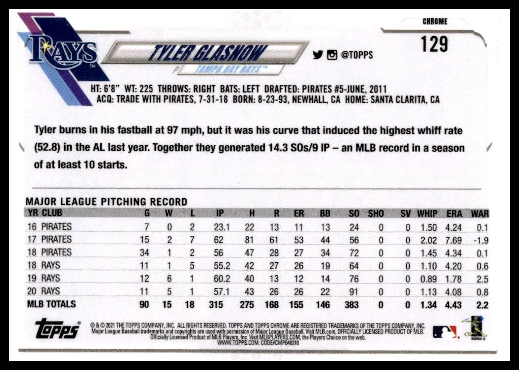 This BaseballΒ card, from 2021 is part of the Topps ChromeΒ card set. Tyler Glasnow is featured and has a card number of 129.