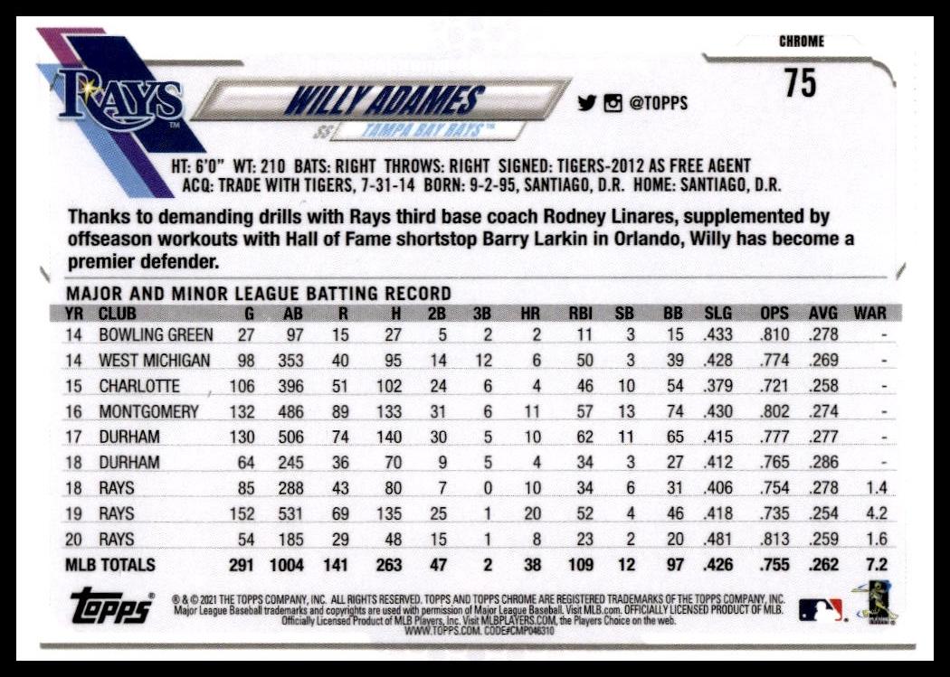 This Baseball card, from 2021 is part of the Topps Chrome card set. Willy Adames is featured and has a card number of 75.
