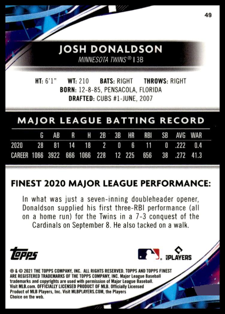 This BaseballΒ card, from 2021 is part of the Topps FinestΒ card set. Josh Donaldson is featured and has a card number of 49.
