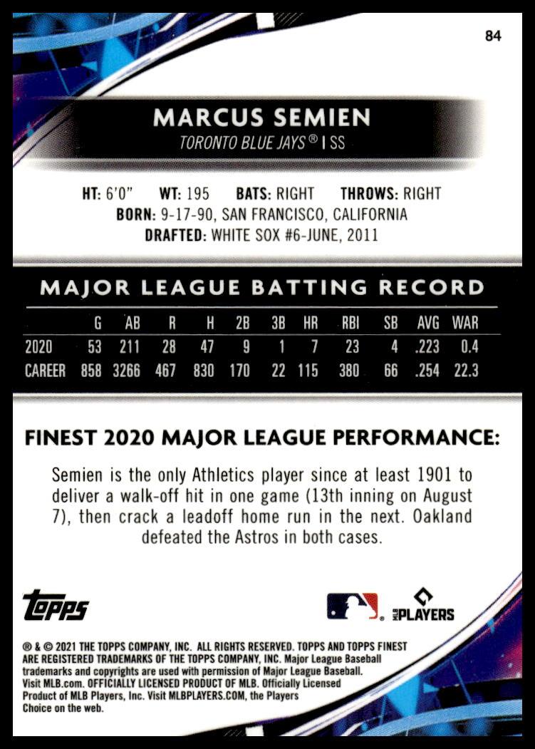 This BaseballΒ card, from 2021 is part of the Topps FinestΒ card set. Marcus Semien is featured and has a card number of 84.
