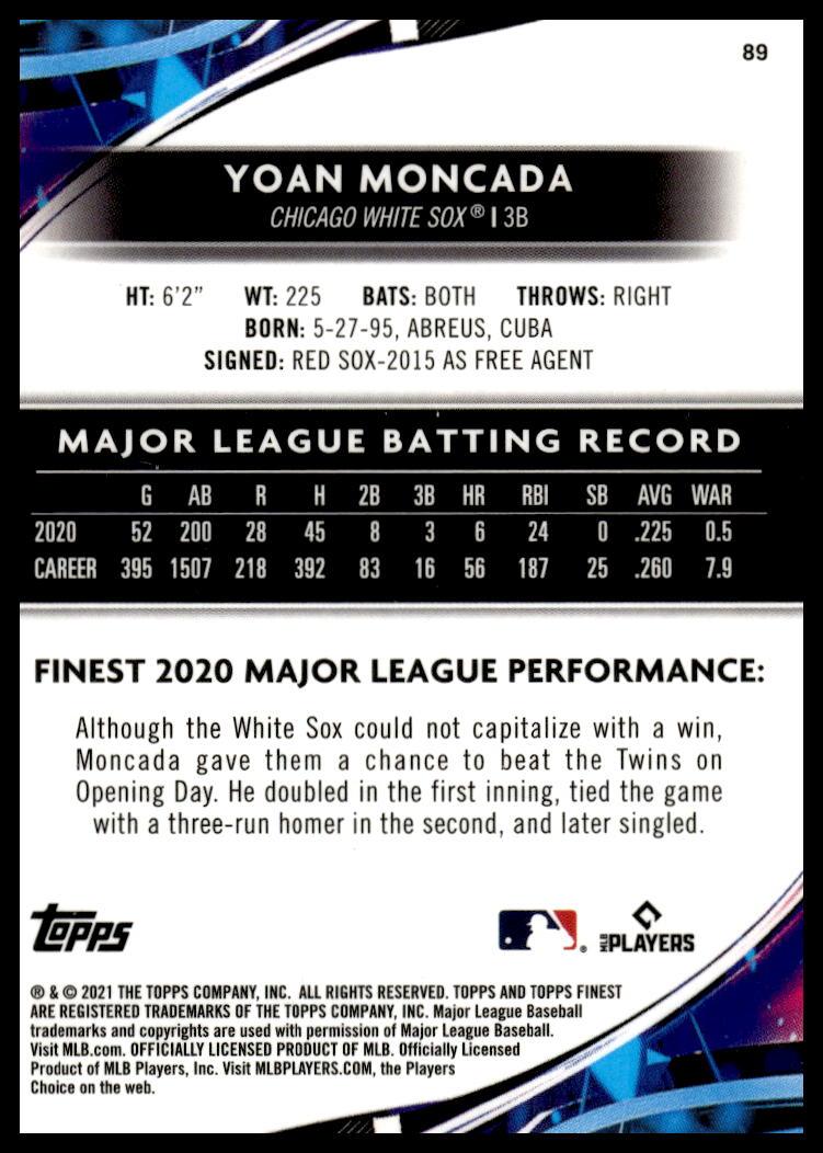 This BaseballΒ card, from 2021 is part of the Topps FinestΒ card set. Yoan Moncada is featured and has a card number of 89.