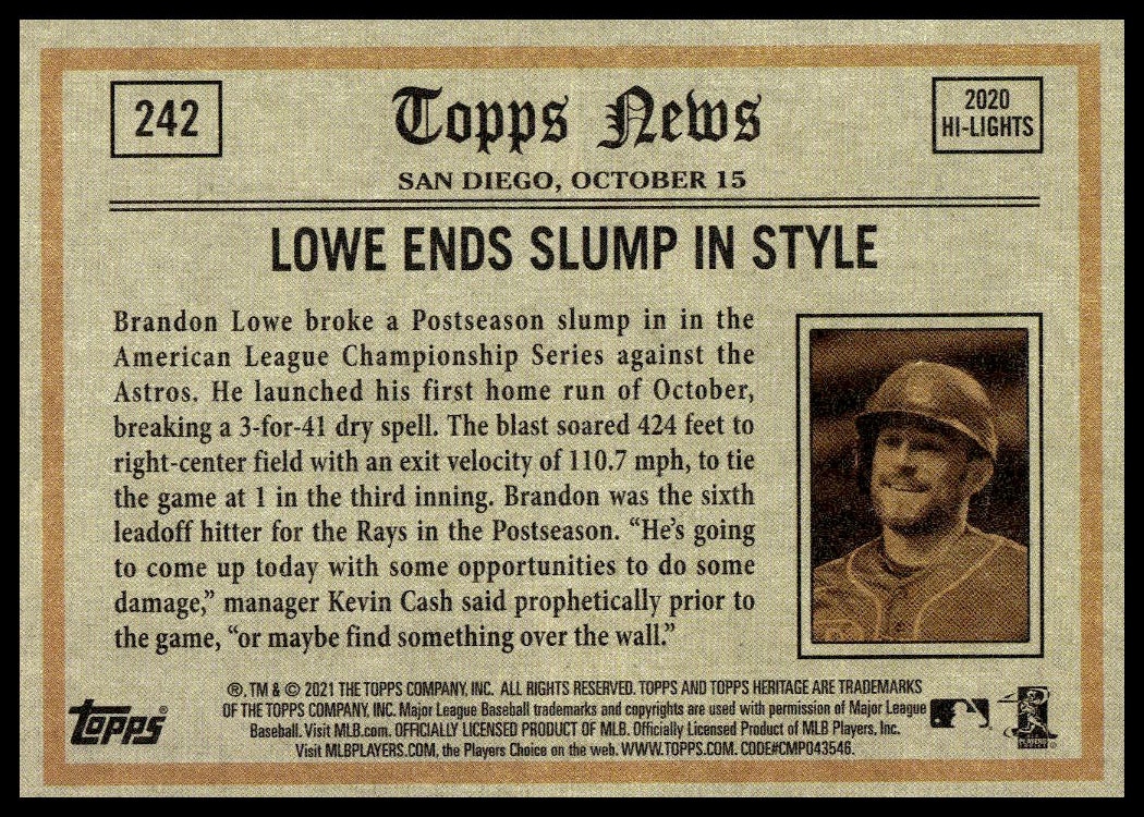 This BaseballΒ card, from 2021 is part of the Topps HeritageΒ card set. Brandon Lowe is featured and has a card number of 242.
