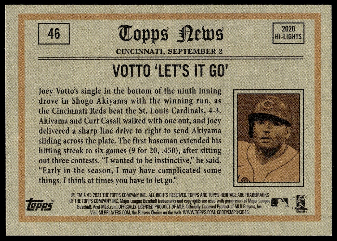 This Baseball card, from 2021 is part of the Topps Heritage card set. Joey Votto is featured and has a card number of 46.