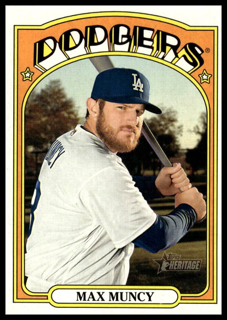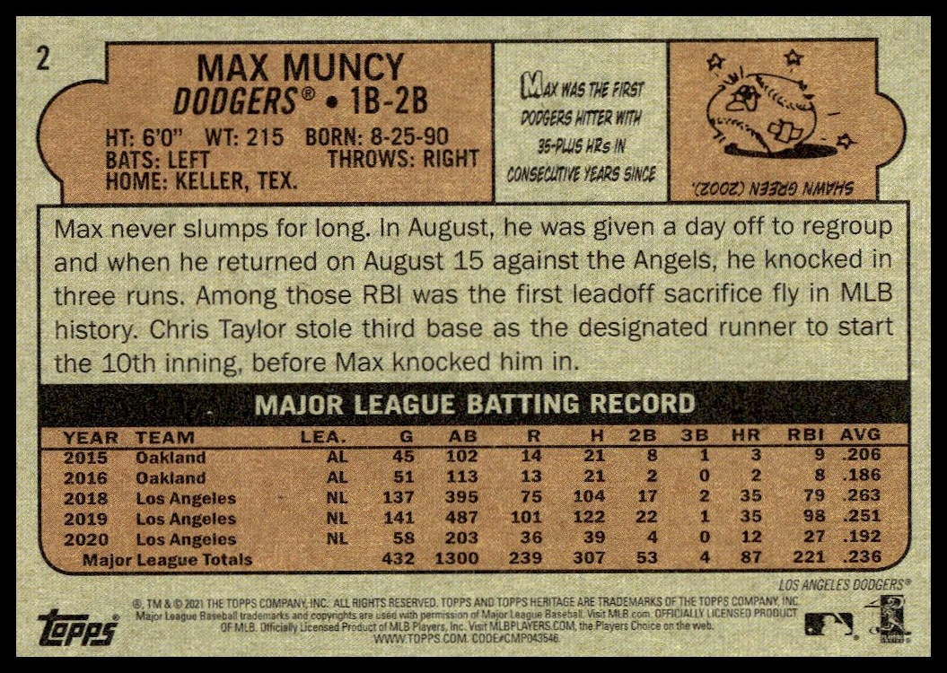This Baseball card, from 2021 is part of the Topps Heritage card set. Max Muncy is featured and has a card number of 2.