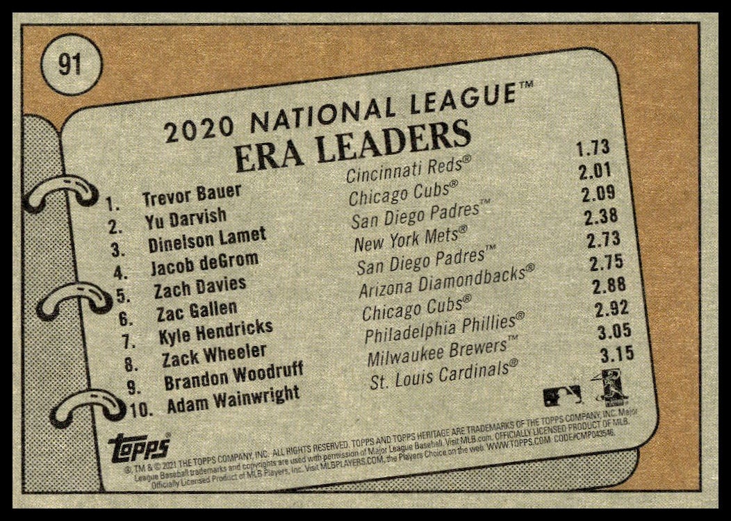This Baseball card, from 2021 is part of the Topps Heritage card set. 2020 NL ERA Leaders (Trevor Bauer / Yu Darvish / Dinelson Lamet) is featured and has a card number of 91.