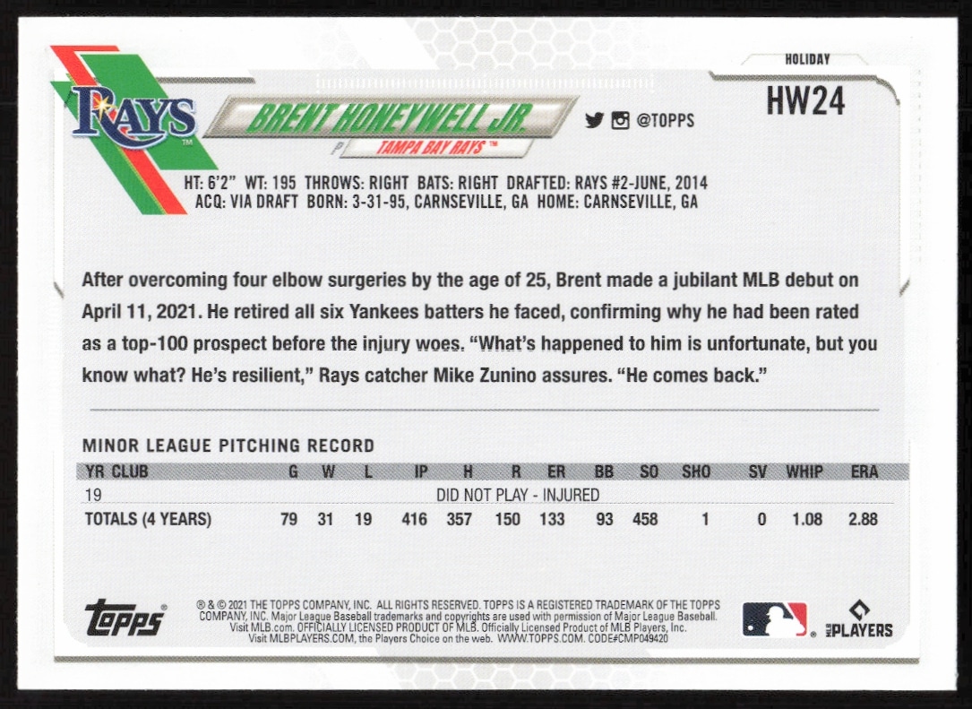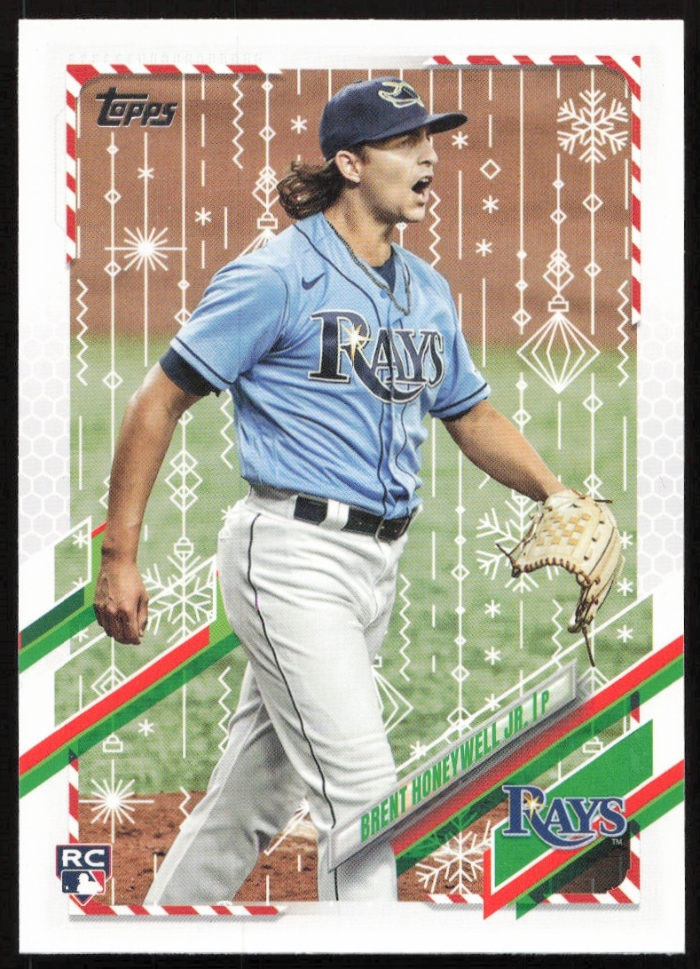This Baseball card, from 2021 is part of the Topps Holiday card set. Brent Honeywell Jr. is featured and has a card number of HW24.