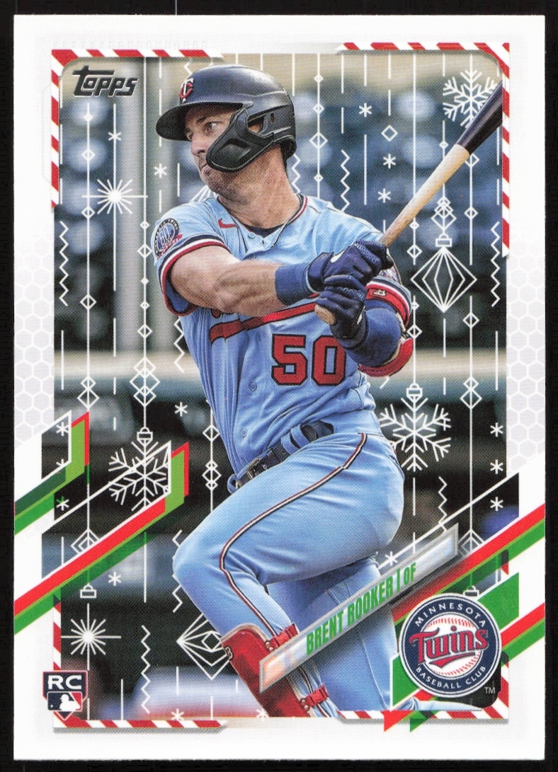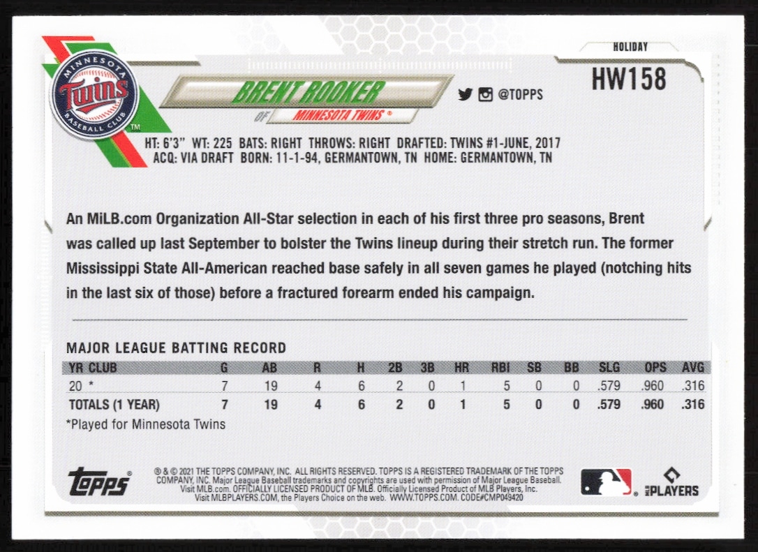 This Baseball card, from 2021 is part of the Topps Holiday card set. Brent Rooker is featured and has a card number of HW158.