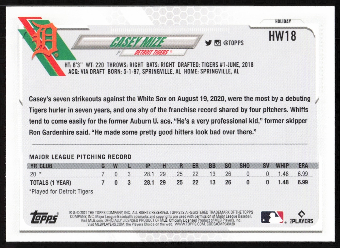 This Baseball card, from 2021 is part of the Topps Holiday card set. Casey Mize is featured and has a card number of HW18.