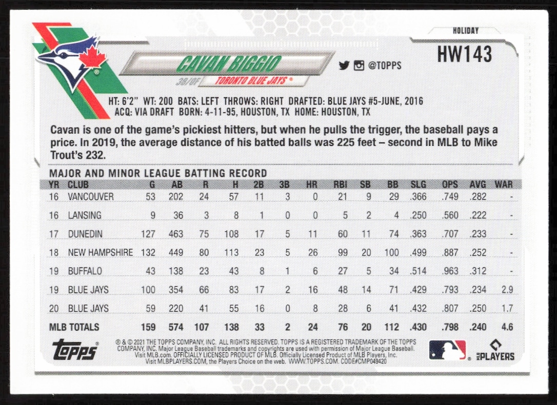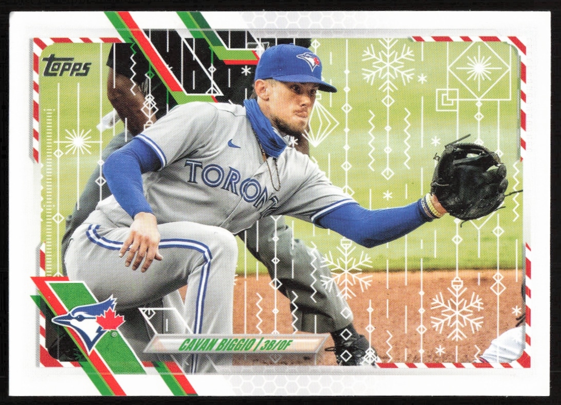 This Baseball card, from 2021 is part of the Topps Holiday card set. Cavan Biggio is featured and has a card number of HW143.