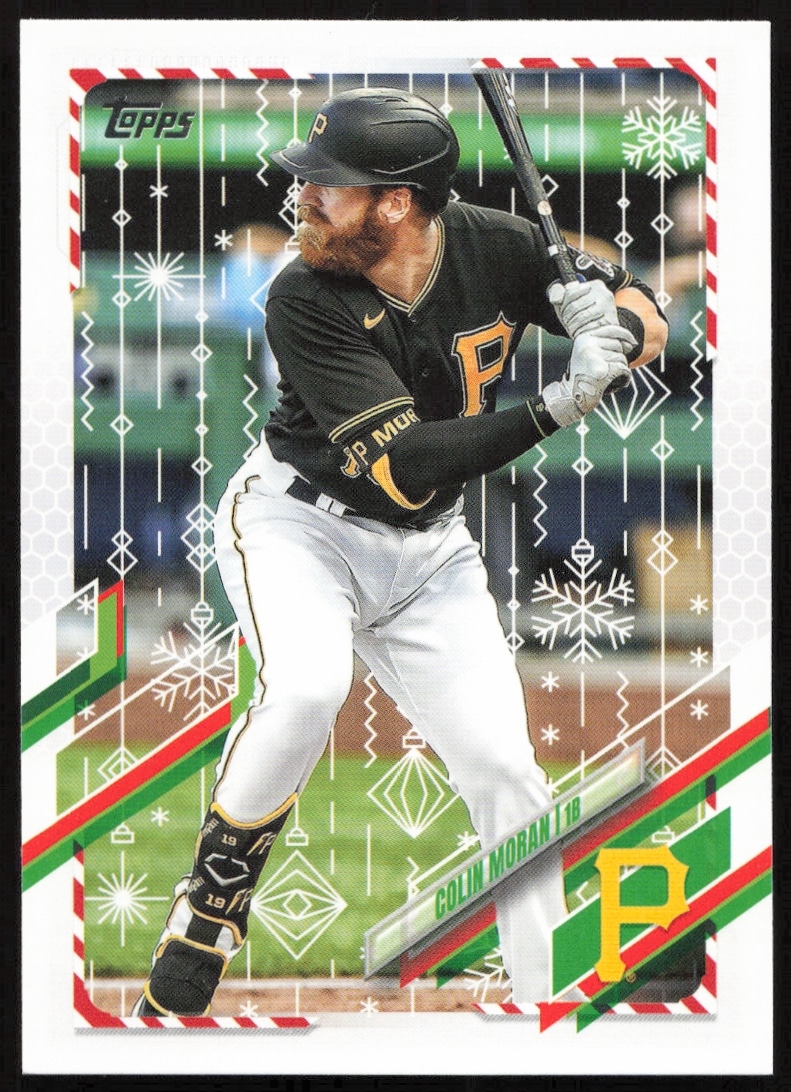This Baseball card, from 2021 is part of the Topps Holiday card set. Colin Moran is featured and has a card number of HW217.