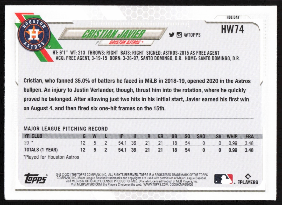 This Baseball card, from 2021 is part of the Topps Holiday card set. Cristian Javier is featured and has a card number of HW74.