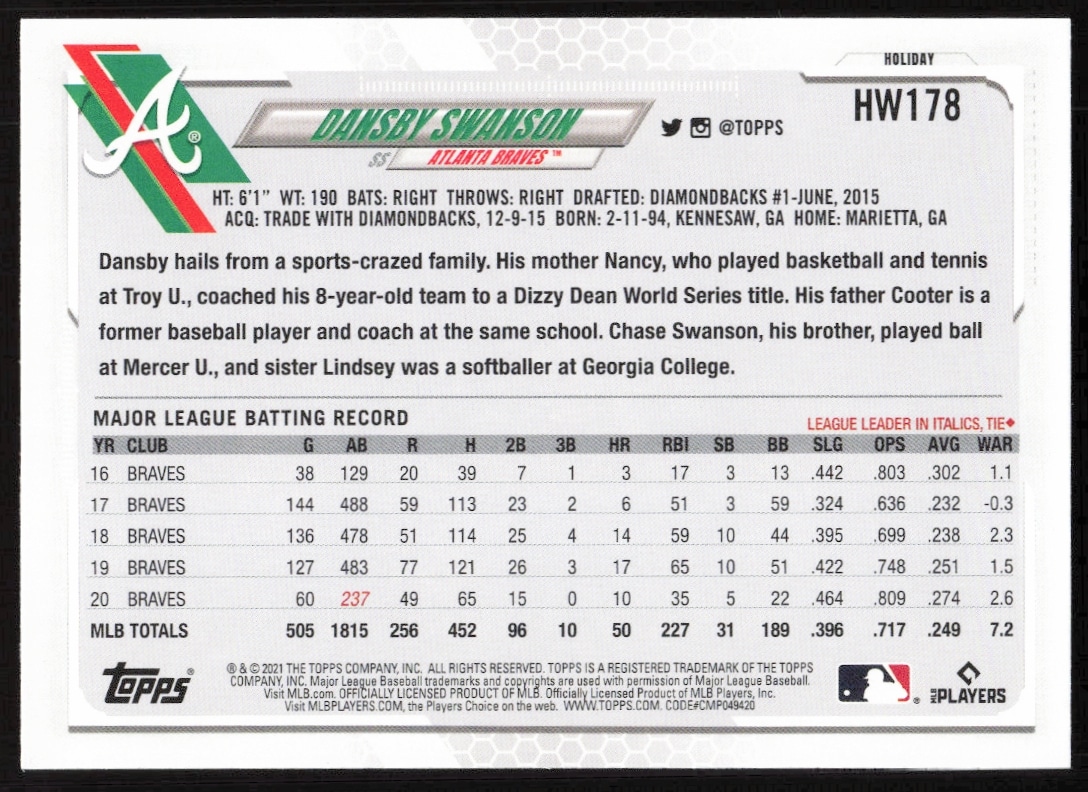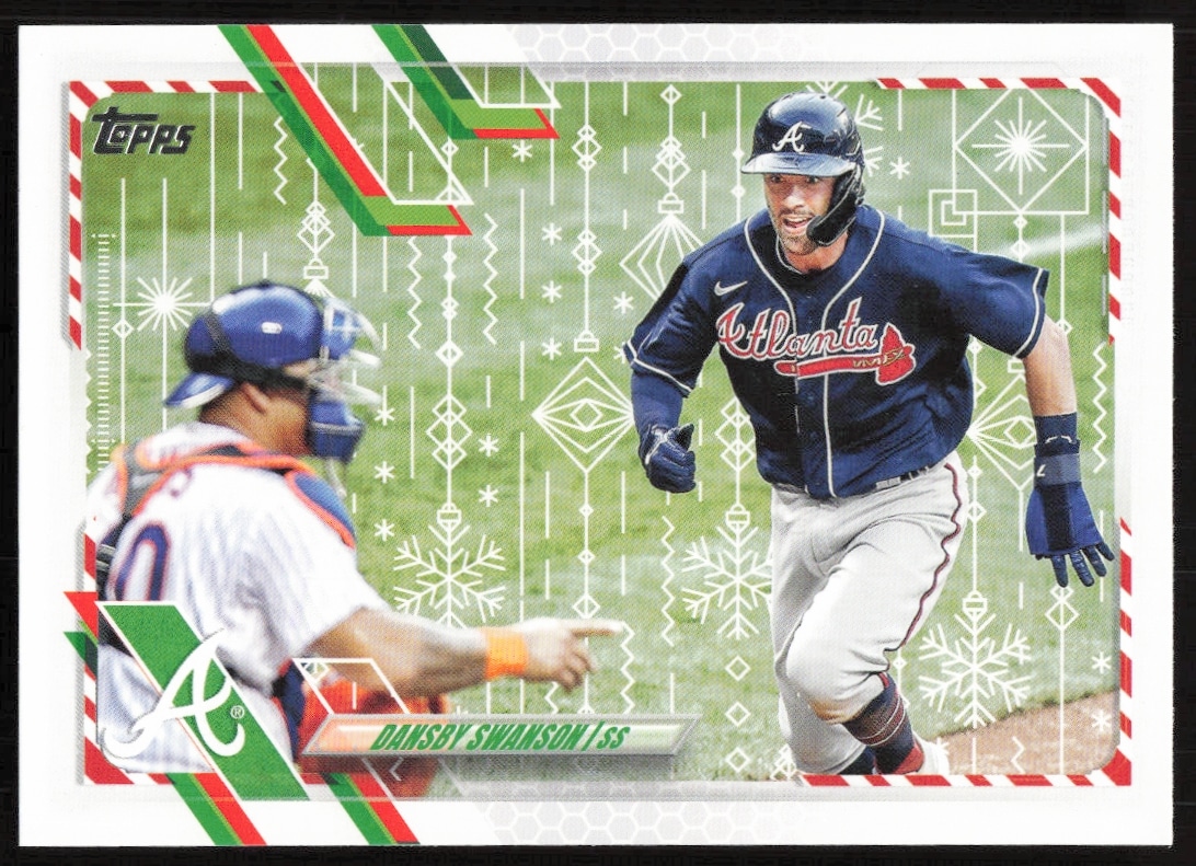 This Baseball card, from 2021 is part of the Topps Holiday card set. Dansby Swanson is featured and has a card number of HW178.