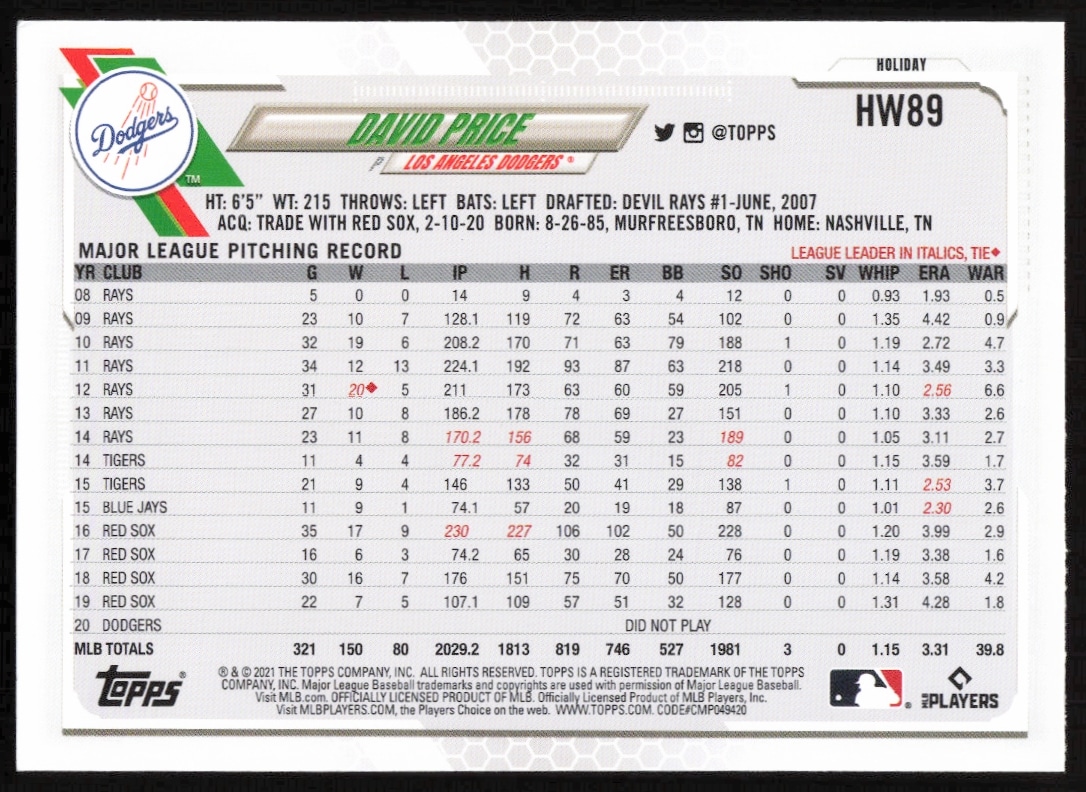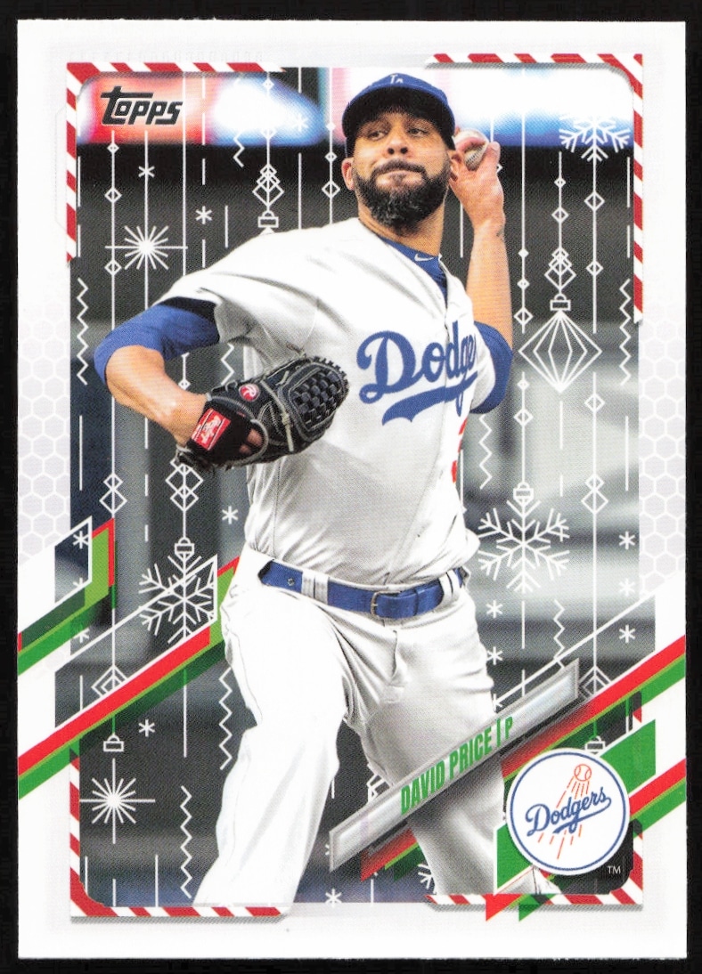 This Baseball card, from 2021 is part of the Topps Holiday card set. David Price is featured and has a card number of HW89.