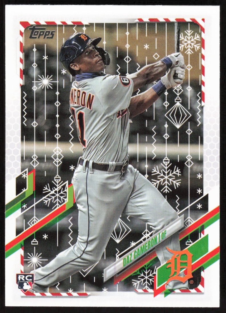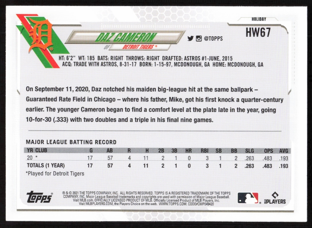 This Baseball card, from 2021 is part of the Topps Holiday card set. Daz Cameron is featured and has a card number of HW67.