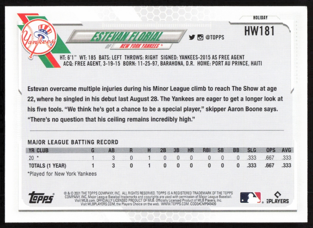 This Baseball card, from 2021 is part of the Topps Holiday card set. Estevan Florial is featured and has a card number of HW181.