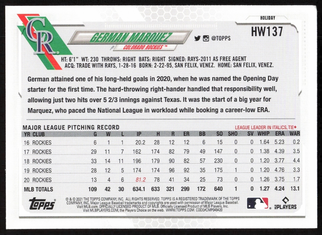 This Baseball card, from 2021 is part of the Topps Holiday card set. German Marquez is featured and has a card number of HW137.