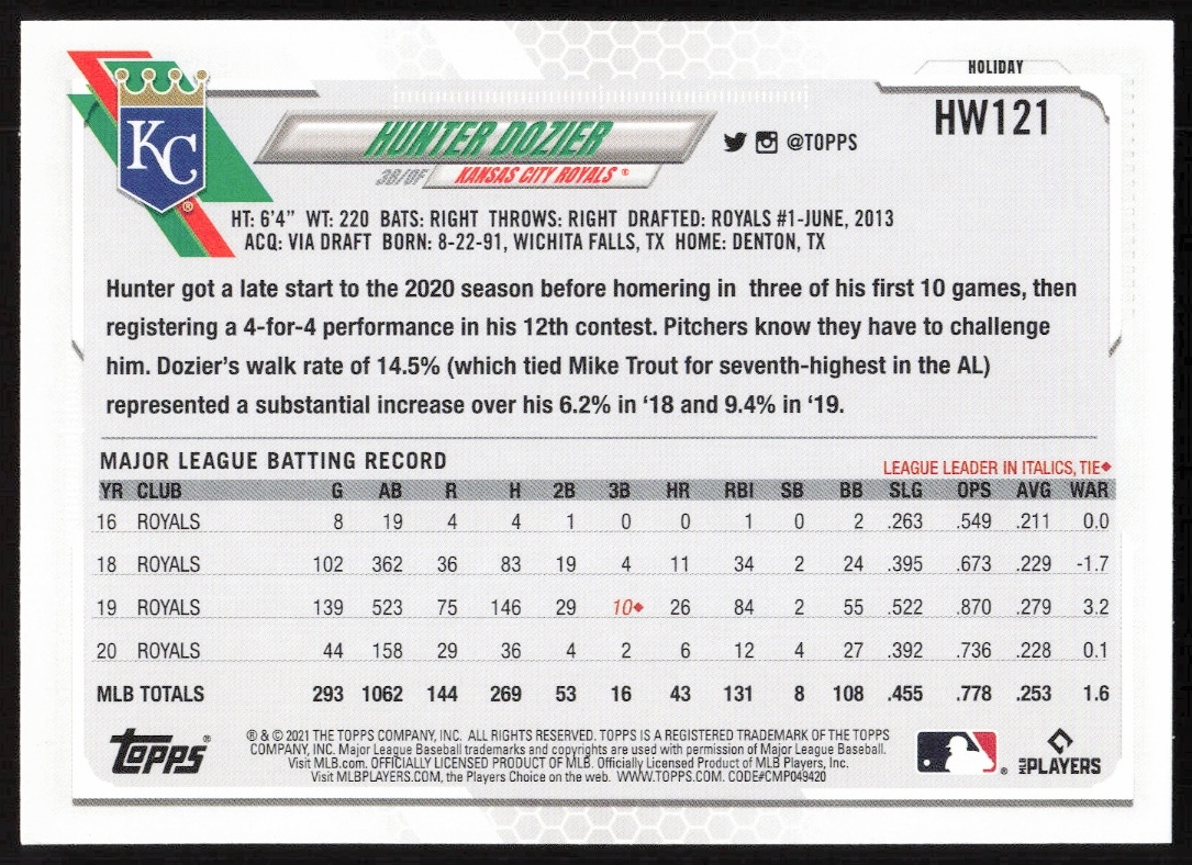 This Baseball card, from 2021 is part of the Topps Holiday card set. Hunter Dozier is featured and has a card number of HW121.