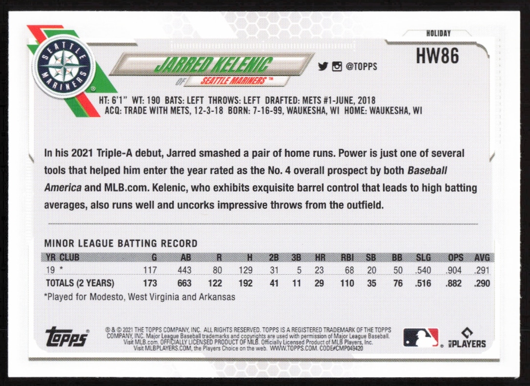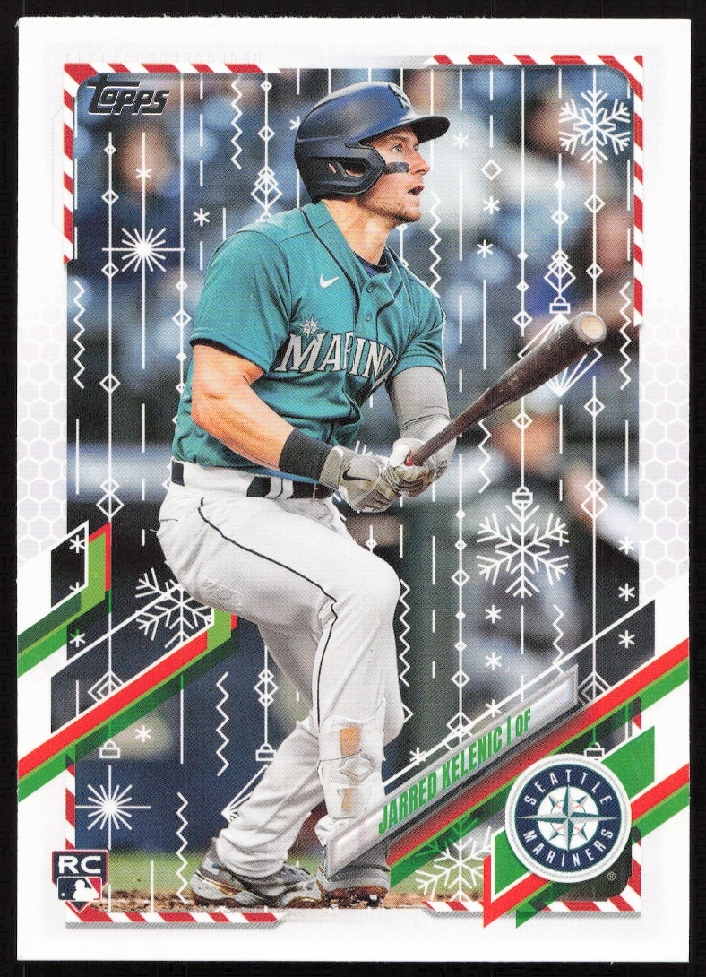 This Baseball card, from 2021 is part of the Topps Holiday card set. Jarred Kelenic is featured and has a card number of HW86.