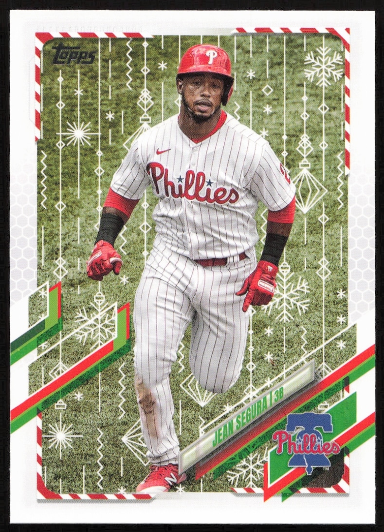 This Baseball card, from 2021 is part of the Topps Holiday card set. Jean Segura is featured and has a card number of HW72.