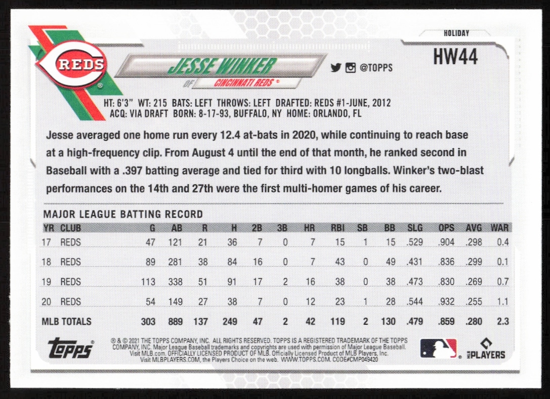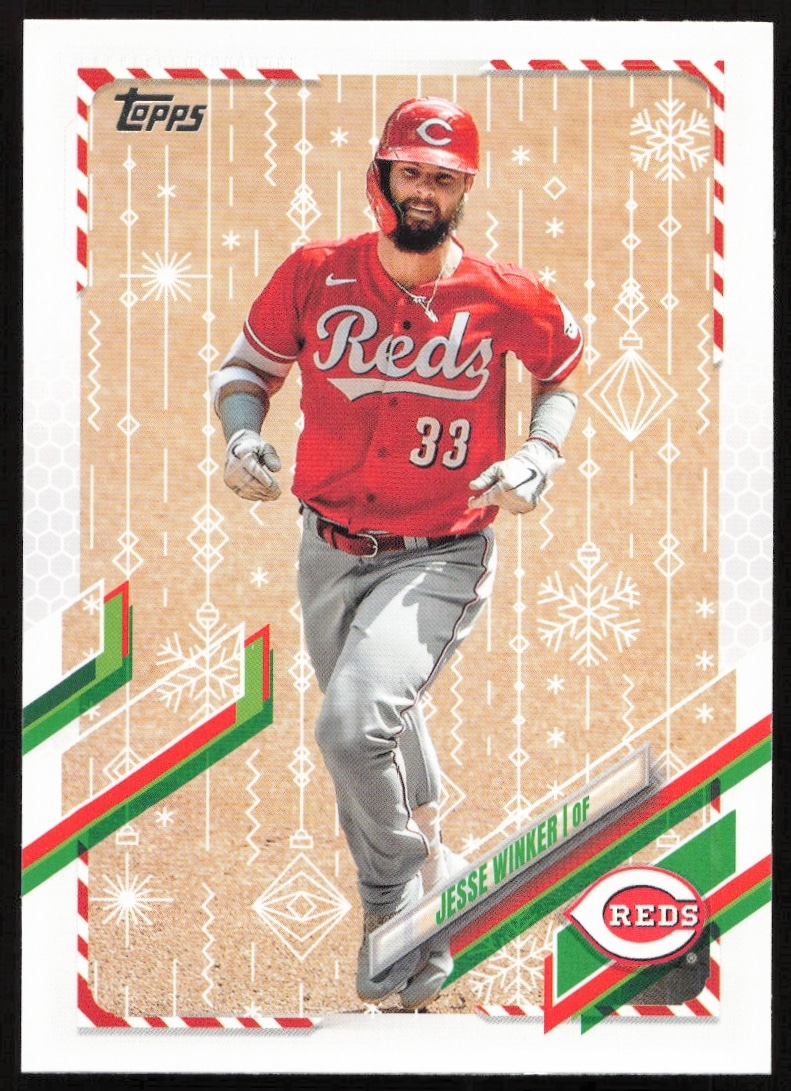 This Baseball card, from 2021 is part of the Topps Holiday card set. Jesse Winker is featured and has a card number of HW44.