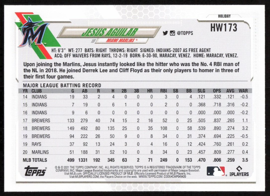 This Baseball card, from 2021 is part of the Topps Holiday card set. Jesus Aguilar is featured and has a card number of HW173.