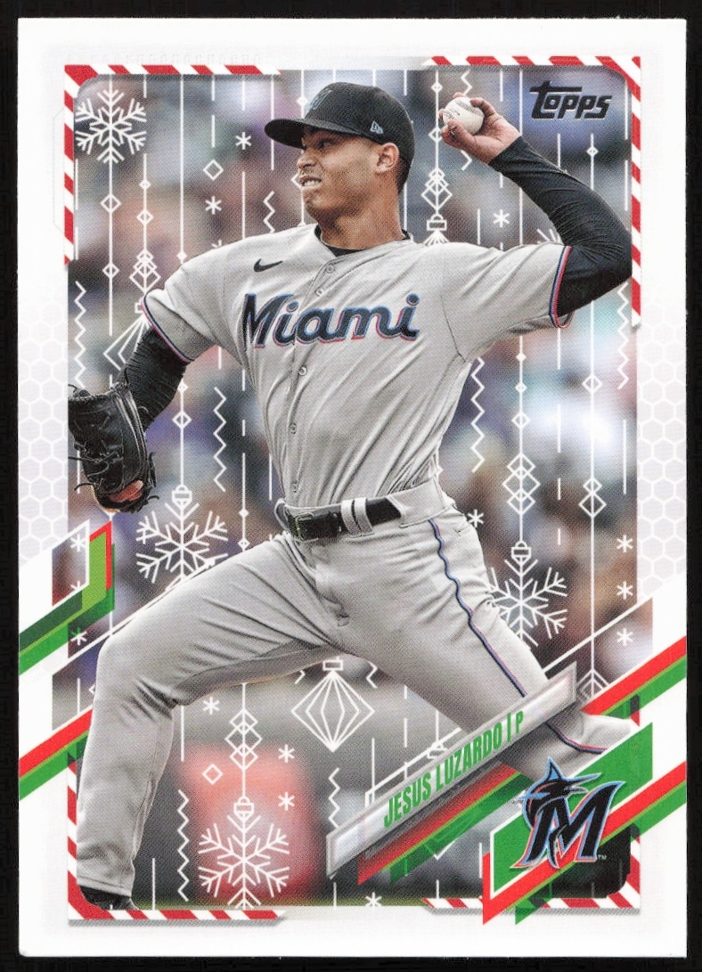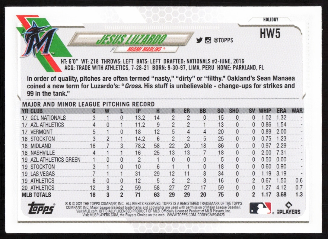 This Baseball card, from 2021 is part of the Topps Holiday card set. Jesus Luzardo is featured and has a card number of HW5.
