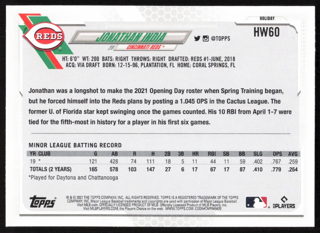 This Baseball card, from 2021 is part of the Topps Holiday card set. Jonathan India is featured and has a card number of HW60.