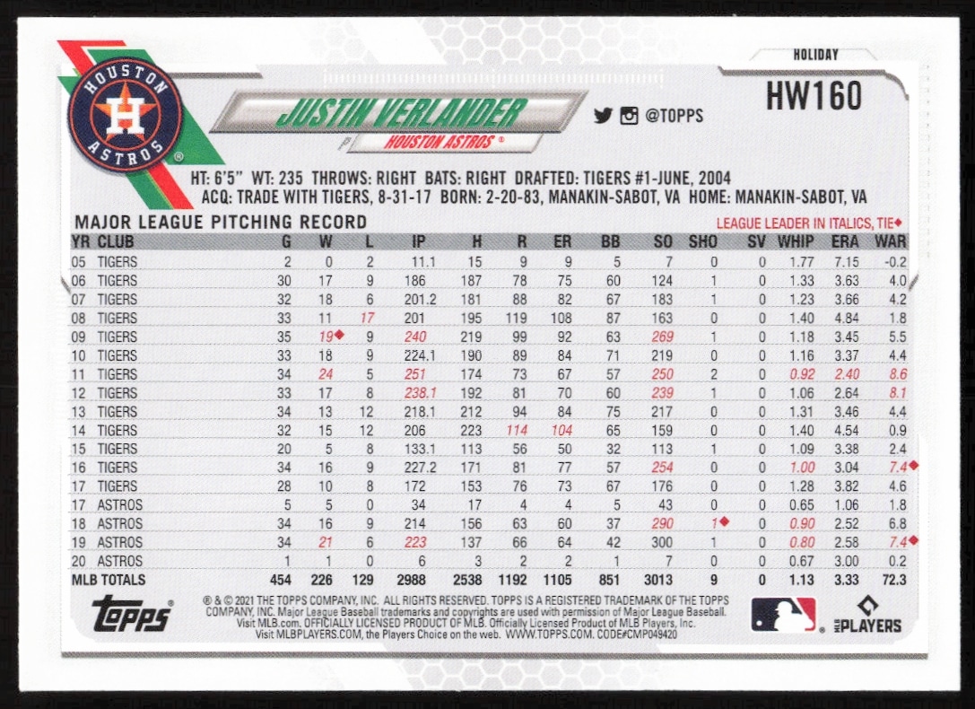 This Baseball card, from 2021 is part of the Topps Holiday card set. Justin Verlander is featured and has a card number of HW160.