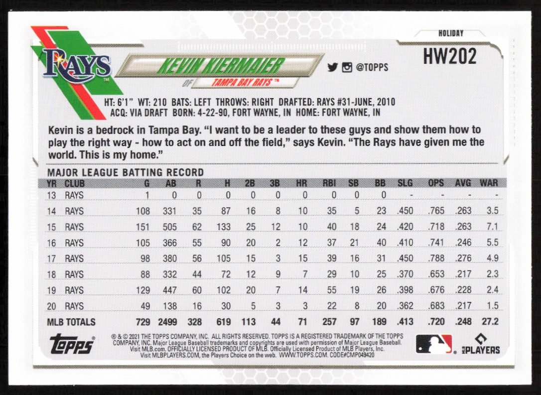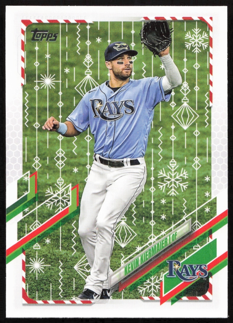 This Baseball card, from 2021 is part of the Topps Holiday card set. Kevin Kiermaier is featured and has a card number of HW202.