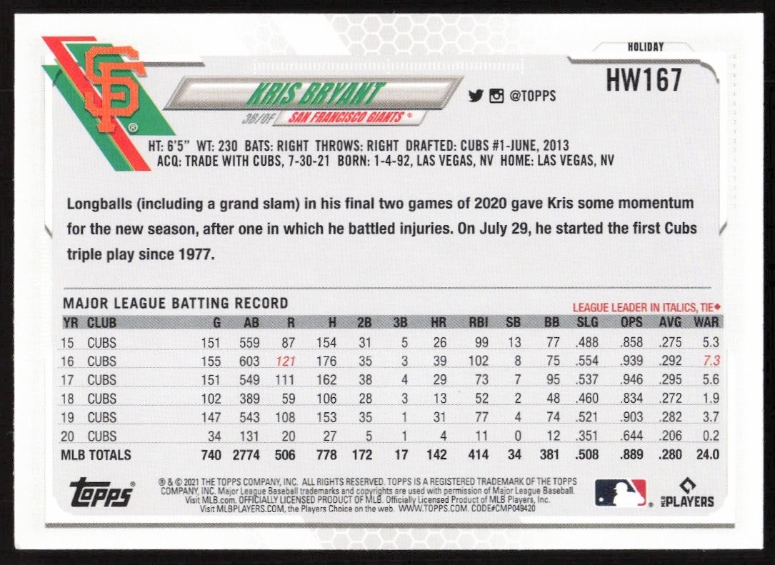 This Baseball card, from 2021 is part of the Topps Holiday card set. Kris Bryant is featured and has a card number of HW167.