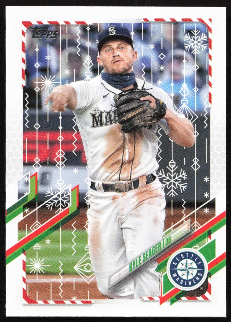 This Baseball card, from 2021 is part of the Topps Holiday card set. Kyle Seager is featured and has a card number of HW92.