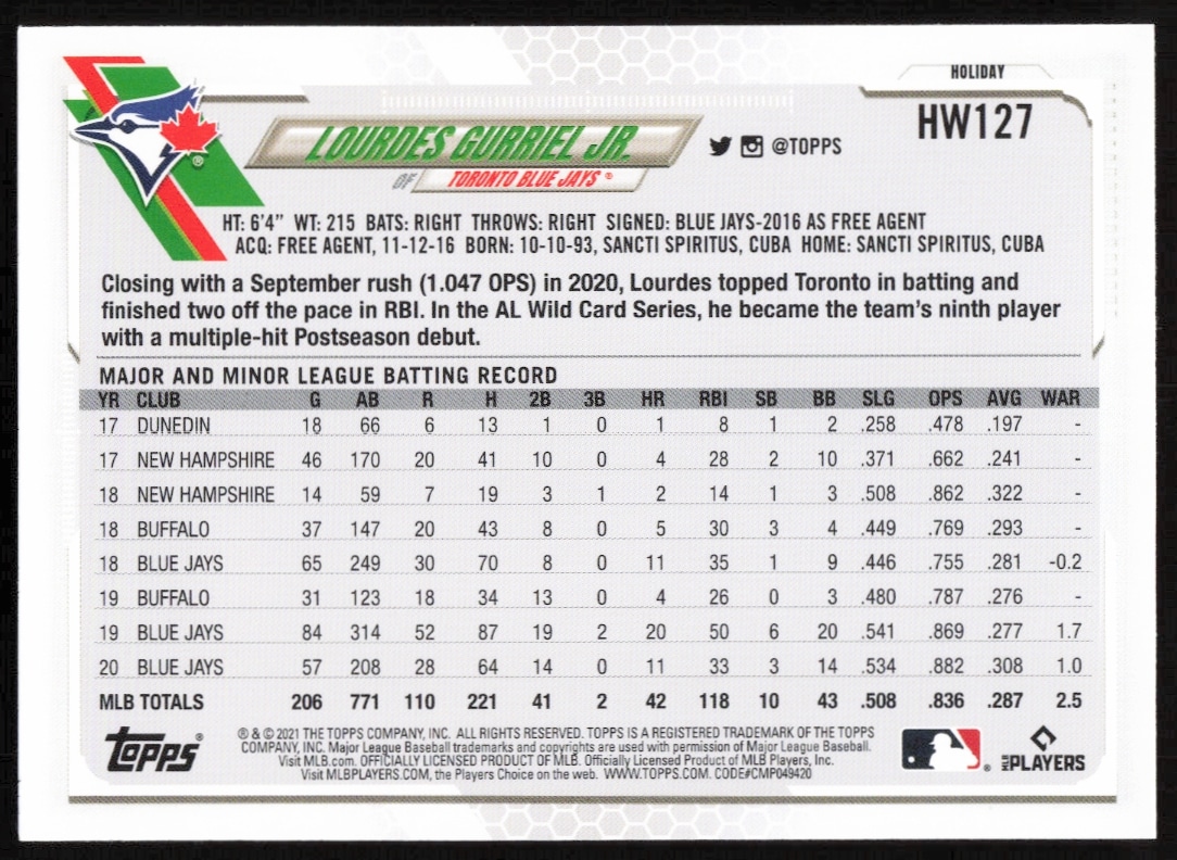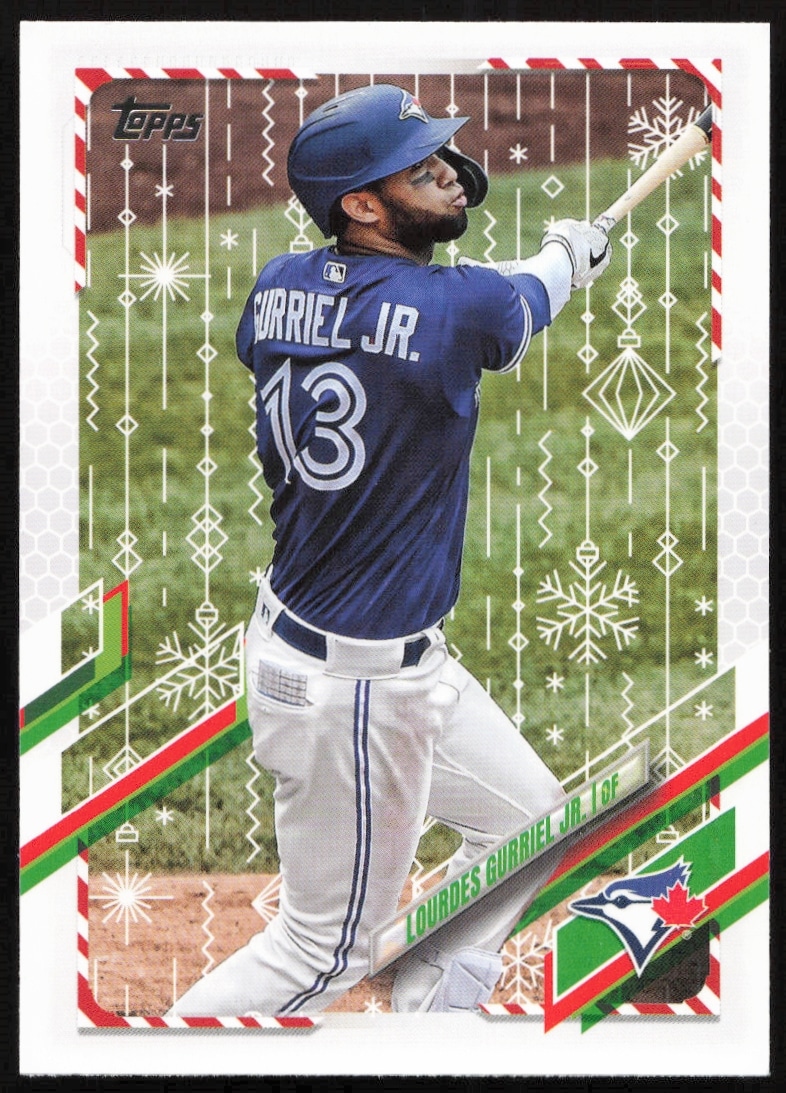 This Baseball card, from 2021 is part of the Topps Holiday card set. Lourdes Gurriel Jr. is featured and has a card number of HW127.