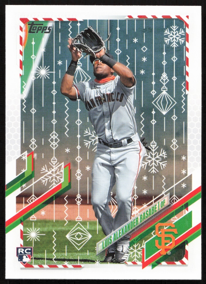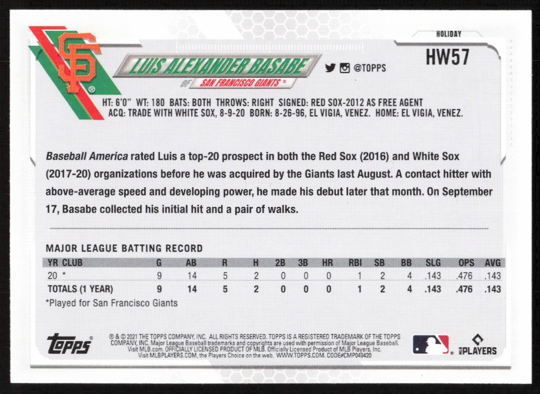 This Baseball card, from 2021 is part of the Topps Holiday card set. Luis Alexander Basabe is featured and has a card number of HW57.