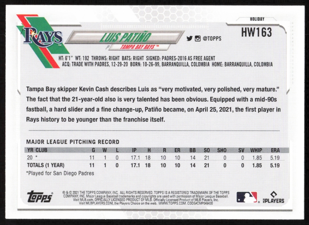 This Baseball card, from 2021 is part of the Topps Holiday card set. Luis Patino is featured and has a card number of HW163.