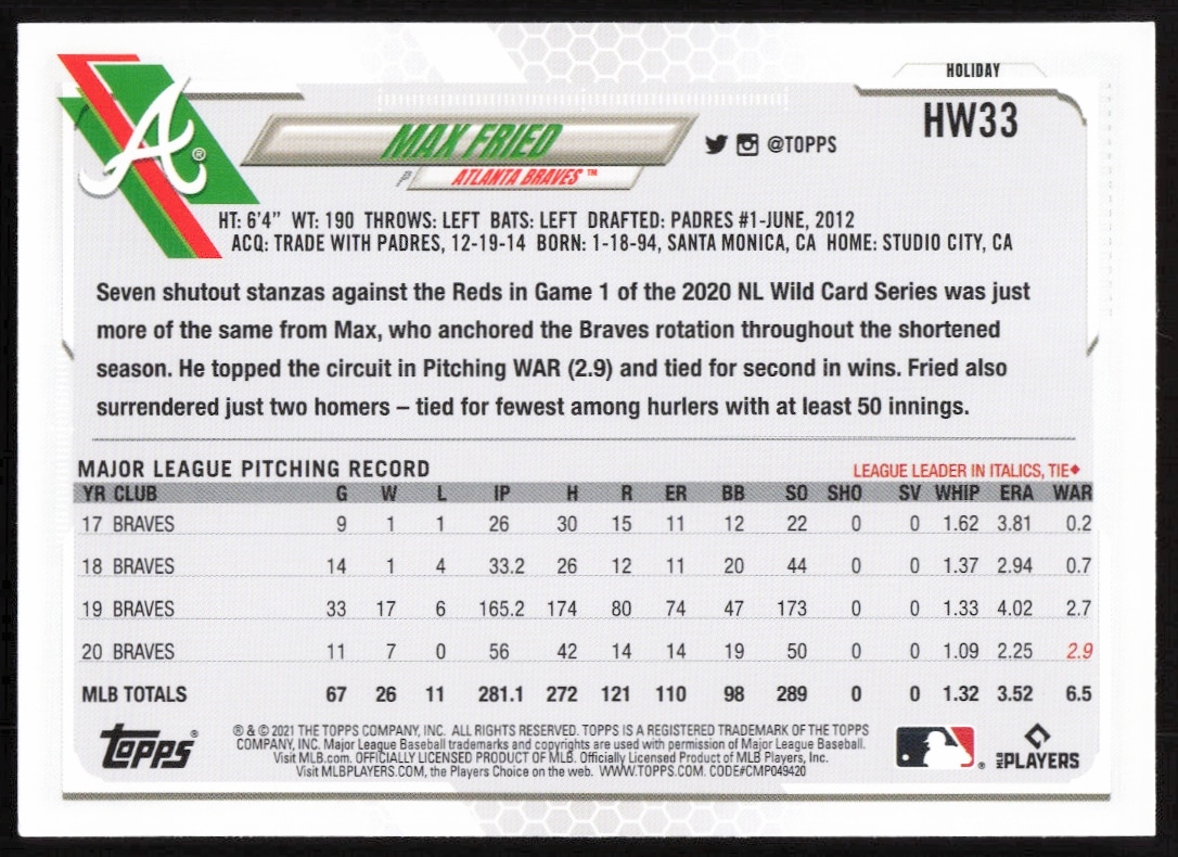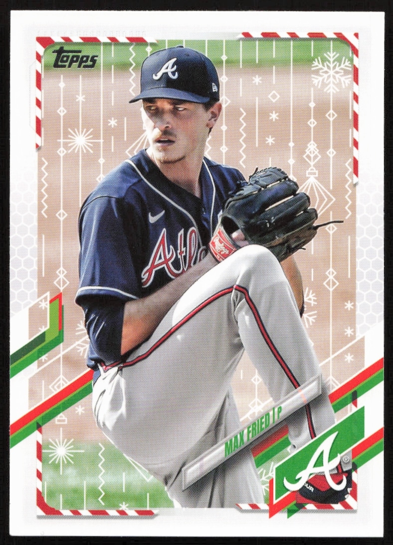 This Baseball card, from 2021 is part of the Topps Holiday card set. Max Fried is featured and has a card number of HW33.