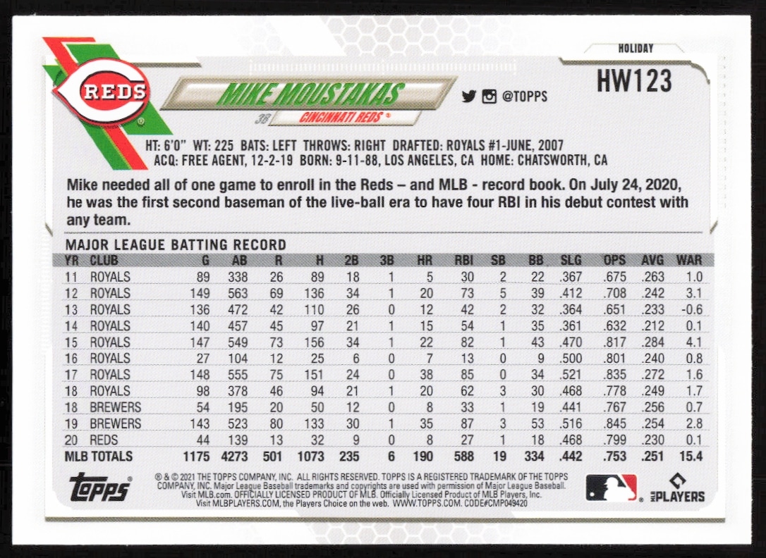 This Baseball card, from 2021 is part of the Topps Holiday card set. Mike Moustakas is featured and has a card number of HW123.